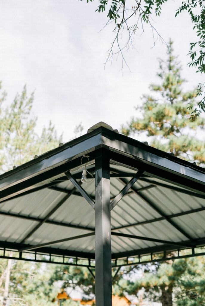 A hardtop gazebo features a solid roof made from materials like metal or polycarbonate, offering more durability and protection than a fabric-topped model.