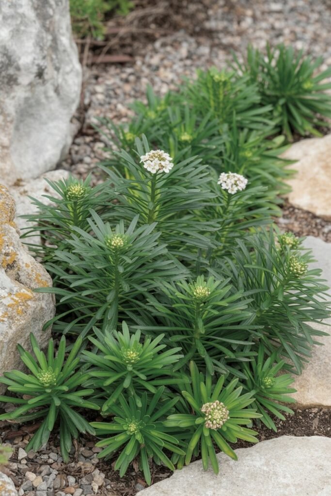 I appreciate Candytuft for its dual-season performance – staying green all winter and producing carpets of white flowers in spring. This low-growing perennial maintains its evergreen foliage even in harsh winter conditions.