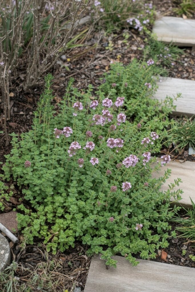 I love creeping thyme for its practical benefits beyond just staying green – it’s rugged enough to walk on and releases pleasant scents when crushed. This mat-forming groundcover helps control erosion while suppressing weeds.