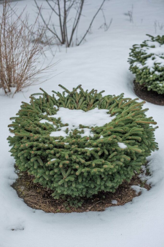 I find Bird’s Nest Spruce fascinating because of its unique growth habit that resembles a flattened sphere. This type of Norway spruce maintains its distinctive evergreen color while providing interesting architectural form in winter landscapes.