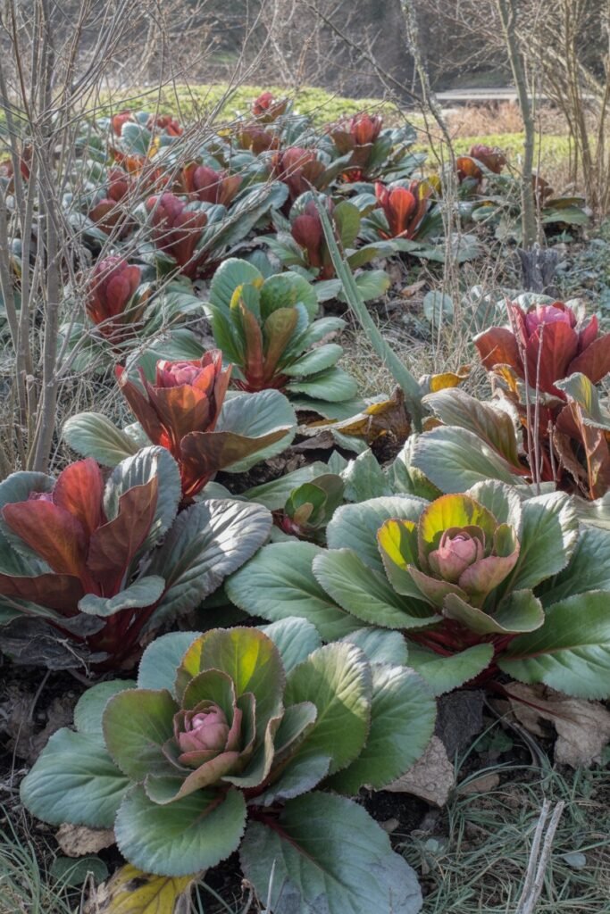 I love how Bergenia, also known as pigsqueak, transforms during winter months. While many consider it primarily for its spring flowers, I grow it specifically for its thick, cabbage-like leaves that remain evergreen in most regions.