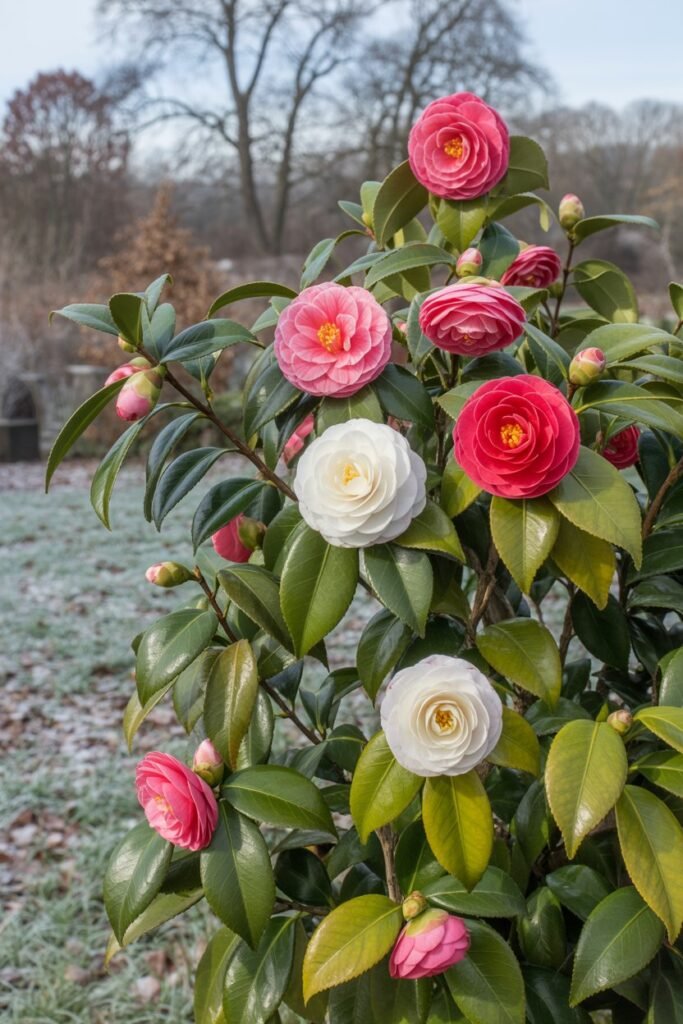 I can’t think of many plants that offer both evergreen foliage and spectacular winter blooms like camellias do. These broadleaf evergreen shrubs maintain their shiny green leaves year-round while producing elegant multi-petaled flowers during the coldest months.