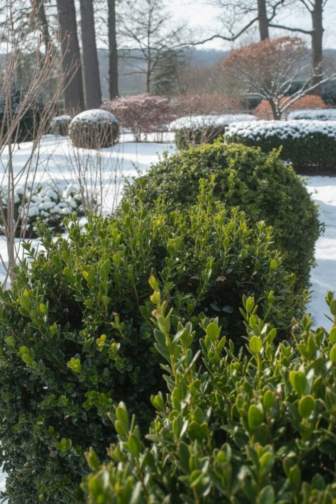 I rely on boxwood as the backbone of many winter garden designs because of its consistent performance and versatility. This popular evergreen shrub maintains excellent green color throughout winter, providing structure and formality when other plants have lost their leaves.