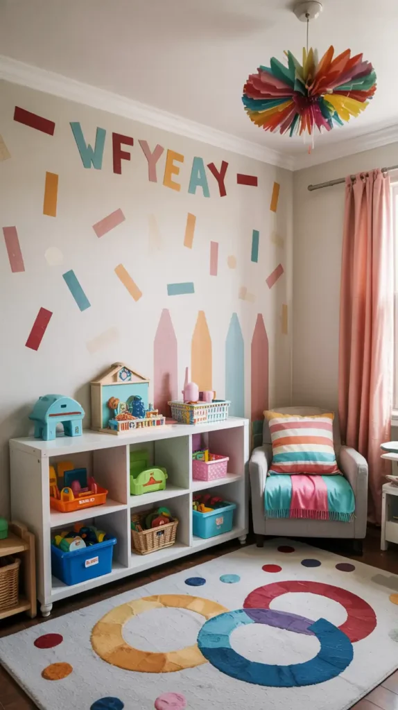 For a room that feels like a constant celebration, I love the idea of a confetti-inspired theme. This isn’t about one single paint color, but rather using a neutral backdrop, like a crisp white, and adding pops of rainbow colors through decals or stencils.