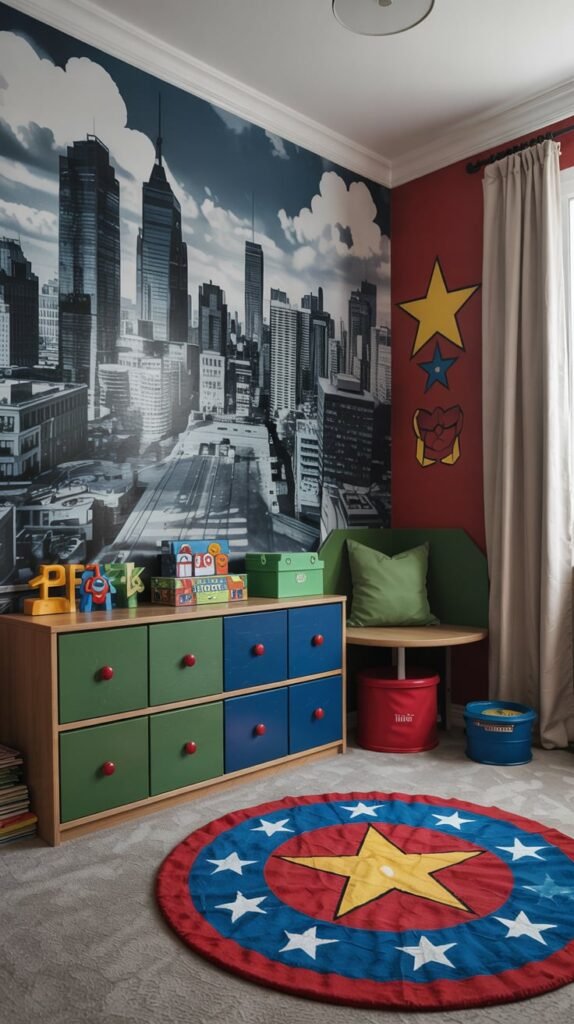 I find that this color scheme works best when grounded by a neutral backdrop. A cityscape wall mural is a perfect choice, providing an exciting setting for countless superhero adventures while tying the bold colors together.
