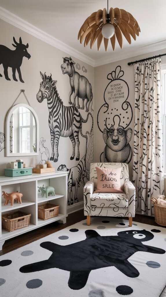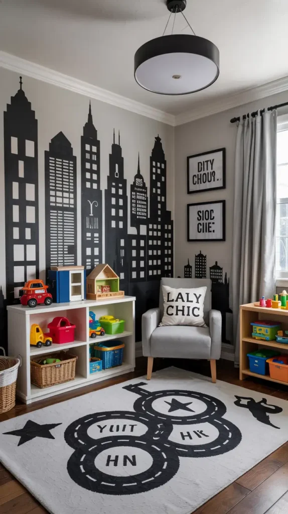 A classic black-and-white color scheme is perfect for a modern, urban-inspired playroom. It’s a sophisticated palette that feels both timeless and cool. I like to play up the theme with bold, graphic patterns or even a cityscape wall decal.