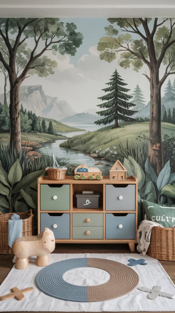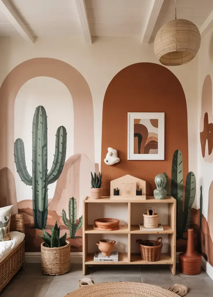 For a warm and earthy playroom, I draw inspiration from the desert. A palette of cactus greens and sun-baked browns creates a calming and natural environment. This color scheme is both modern and timeless.