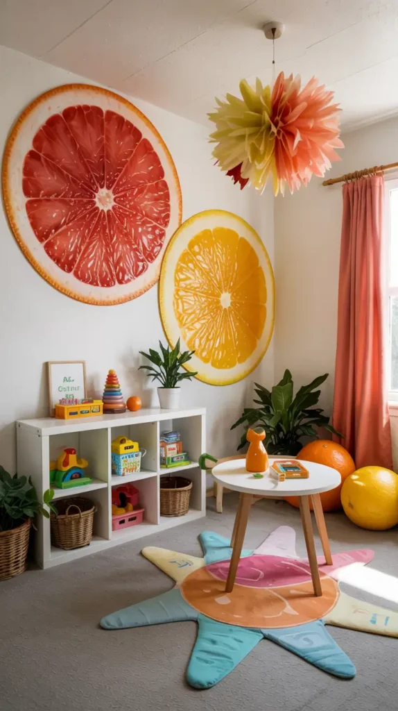 If you want to infuse a playroom with pure energy, citrus hues are the way to go. I love combining shades of grapefruit pink, lemon yellow, and tangerine orange to create a space that feels zesty and full of life.
