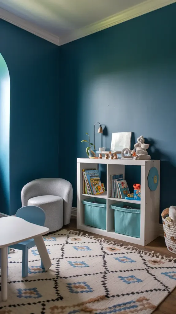For a more sophisticated and moody kids’ space, I suggest using deep, subdued color tones. Moody blues, reminiscent of a stormy sea, create a calm and cozy atmosphere that’s perfect for a reading nook or a quiet play area.