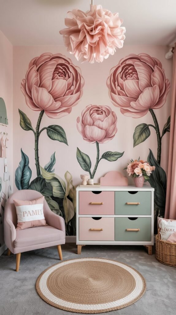 To bring the garden theme to life, I add accents of verdant green, muted aqua, and a hint of peach. This combination feels feminine and sweet without being overly sugary, creating a calm and imaginative space for quiet play.