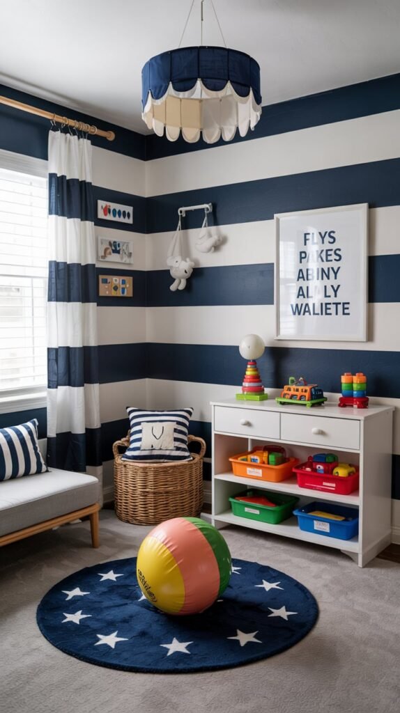 The beauty of this palette is its versatility. You can keep it nautical and crisp, or you can add vibrant, multicolored accessories to make it feel more kid-friendly and fun. The strong contrast provides a great backdrop for colorful toys and artwork.