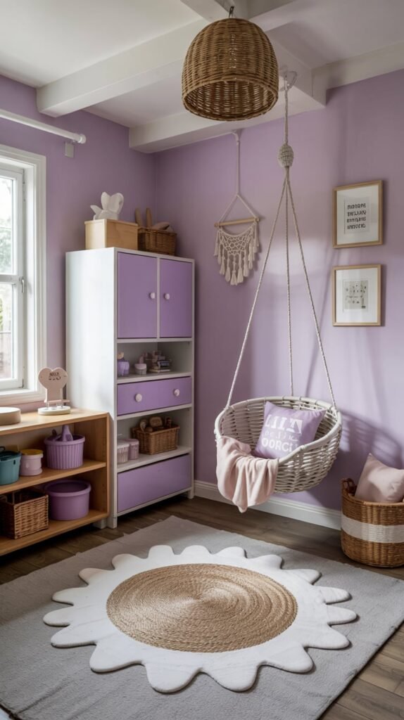 To add warmth to this cool-toned palette, I incorporate natural touches. Light-hued wood furniture, rope details on a hanging chair, or woven baskets bring an earthy element that beautifully complements the lovely lilac walls.