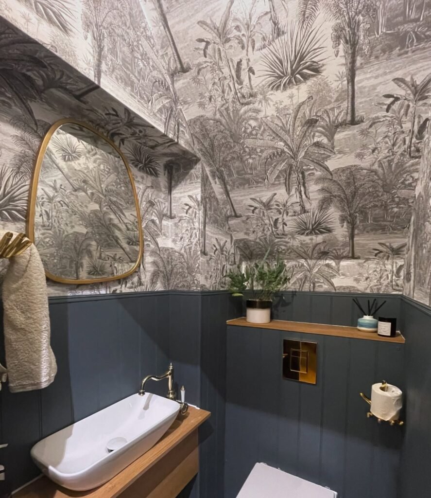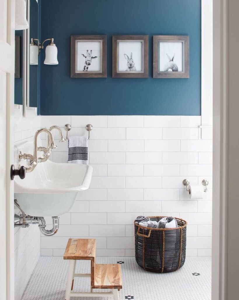 This approach proves that small spaces can handle big statements. The two-tone treatment makes the room feel taller while the rich navy provides a luxurious foundation for the playful wallpaper above.