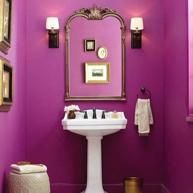 Bold magenta walls transform this powder room into a showstopper. This fearless color choice demonstrates how small bathroom paint colors can create unforgettable spaces. The vibrant pink feels both playful and sophisticated.