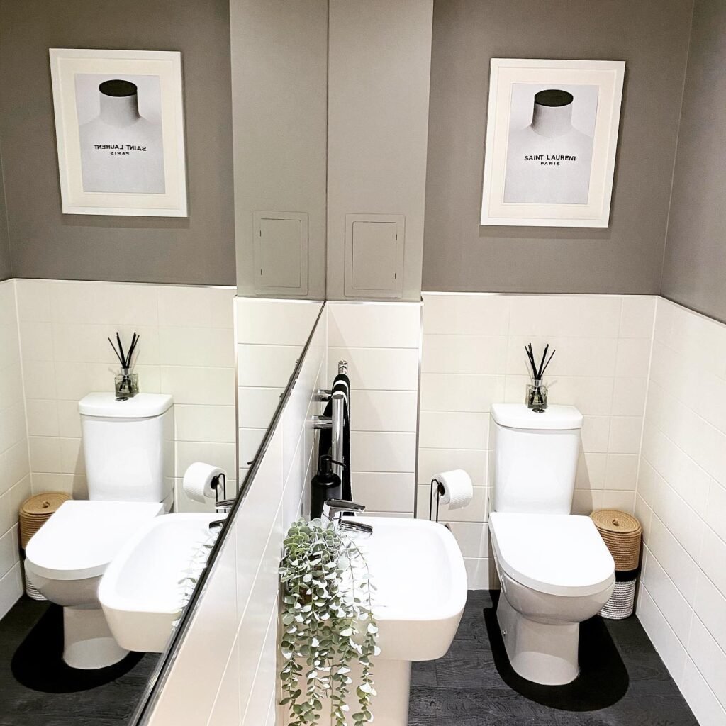 This demonstrates how neutral small bathroom paint colors can feel anything but boring. This sophisticated gray creates a gallery-like backdrop that lets the white fixtures and artwork shine. The dual-toilet setup might be unconventional, but the color palette keeps everything cohesive and elegant.