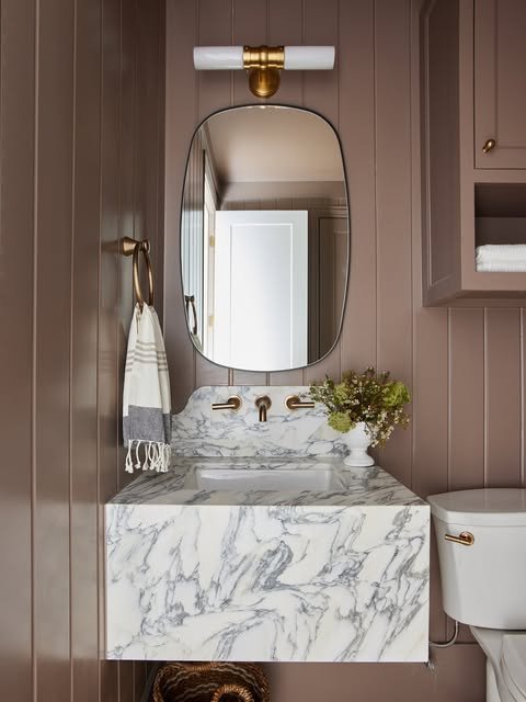 This showcases how warm, neutral small bathroom paint colors create an instantly calming environment. This soft taupe shade wraps the space in understated elegance while the gorgeous marble vanity steals the show. The color choice allows the dramatic veining in that stunning countertop to take center stage.
