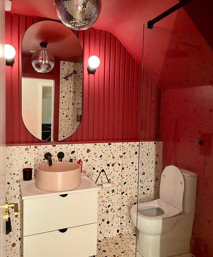 White fixtures keep the space from feeling chaotic, while that disco ball adds unexpected whimsy. The floating vanity helps maintain an airy feel despite the intense wall color. This design shows how confident homeowners can use dramatic small bathroom paint colors to create spaces with serious personality and flair.