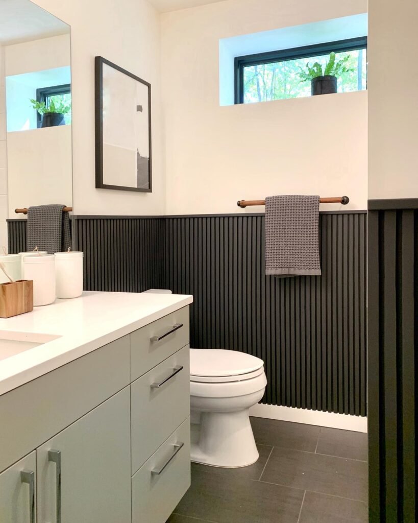 This highlights how soft, neutral small bathroom paint colors create a spa-like retreat. This creamy beige tone feels warm and welcoming while providing the optimal backdrop for natural textures. The dark wood wainscoting adds depth and prevents the light color from feeling flat or boring.