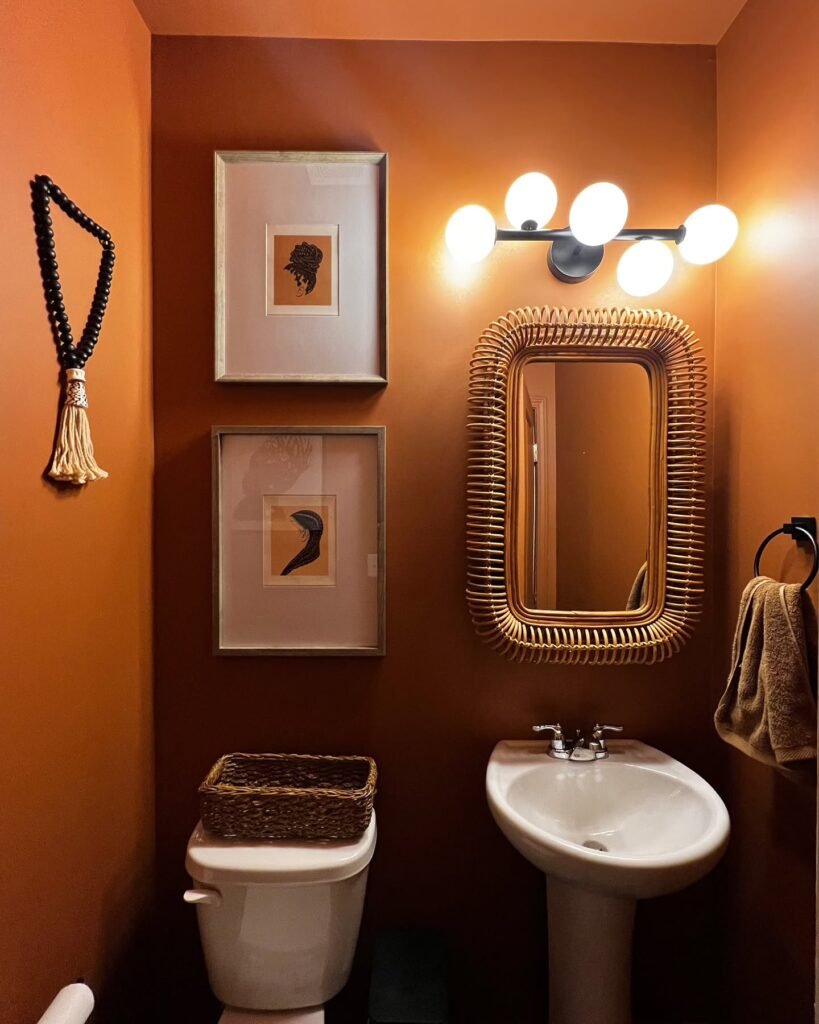 Terracotta walls showcase how small bathroom paint colors can create intimacy in compact spaces. This burnt orange shade wraps the room in warmth, making it feel like a cozy retreat rather than a cramped necessity.