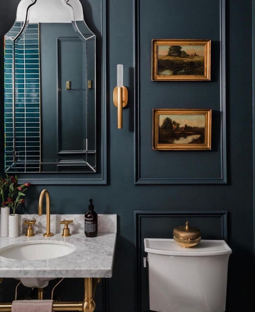 Brass accents shine against the dark backdrop, creating luxurious contrast. Traditional landscape paintings feel at home while modern fixtures keep things current. The marble countertop adds brightness without fighting the wall color.