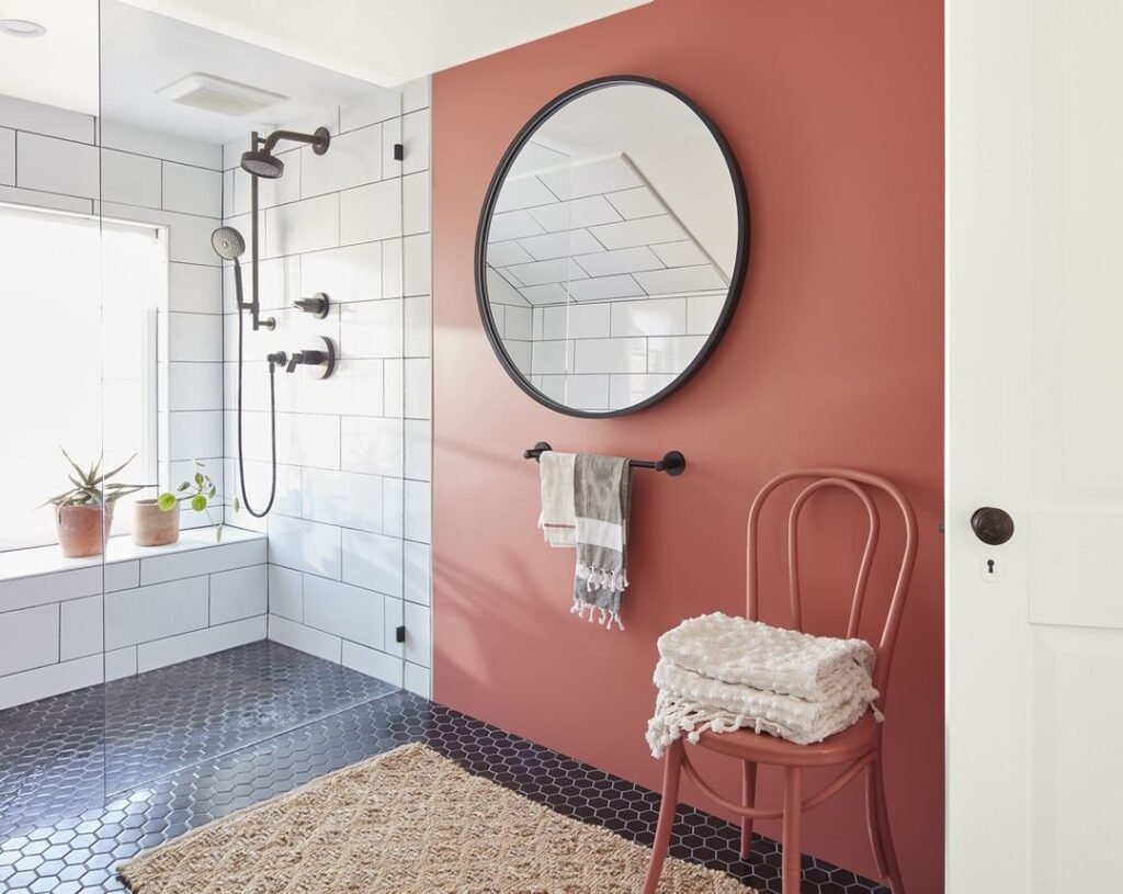 Coral pink shows how small bathroom paint colors can bring joy into functional spaces. This peachy-pink shade creates instant warmth while remaining sophisticated enough for adult spaces. The color feels fresh and contemporary.