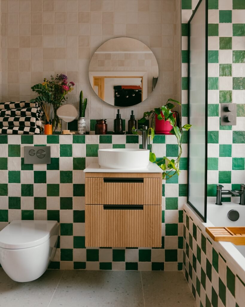 Wood vanity elements warm the space while the circular mirror softens all those angular lines. Plants thrive in this vibrant environment, adding natural elements that complement the green squares.
