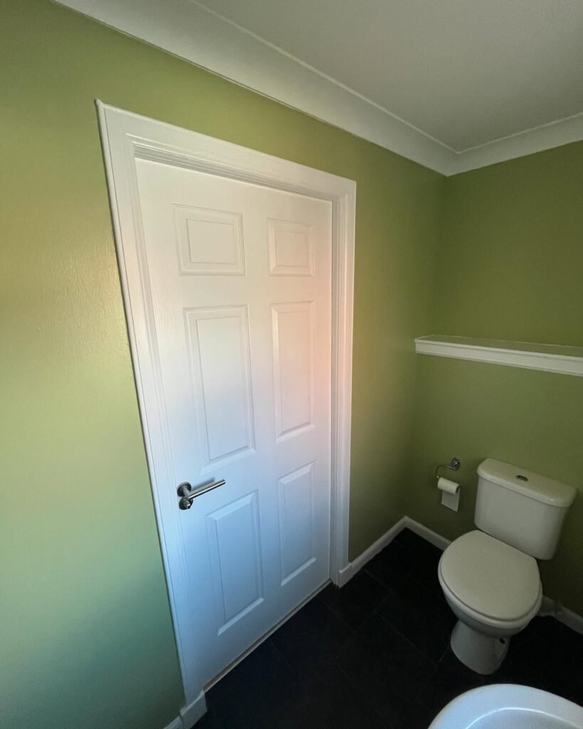 White trim keeps things crisp while the soft green creates a soothing backdrop. The monochromatic approach feels cohesive and peaceful. This shade works beautifully with both warm and cool accent colors.