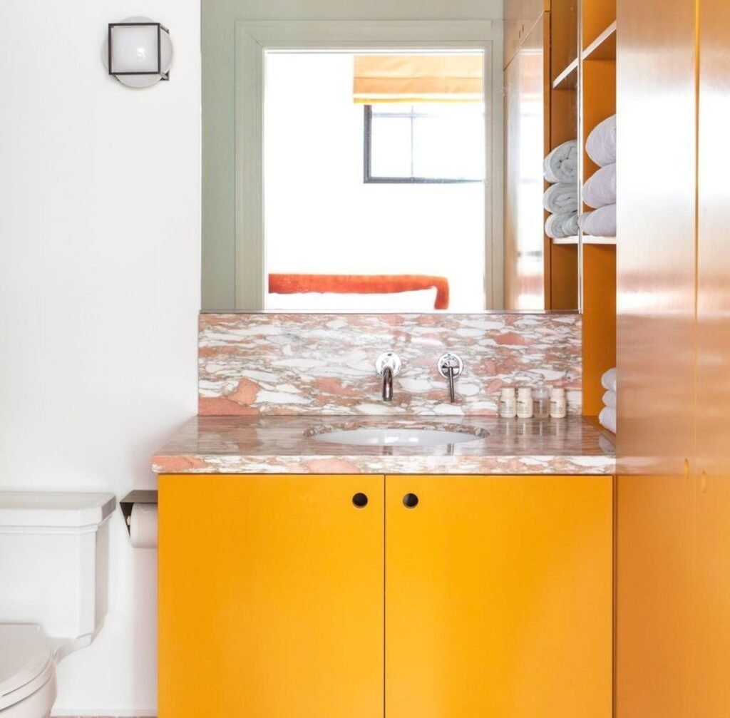 This proves that small bathrooms can embrace joyful colors. The orange creates instant personality while maintaining sophistication through clean lines and quality materials.