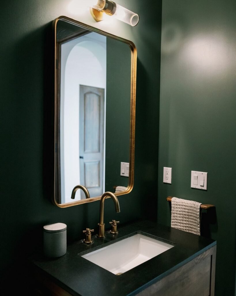 Small bathroom paint colors like this forest green prove that going dark can actually expand a space visually. The enveloping effect creates an intimate, jewel-box feeling that guests will remember.