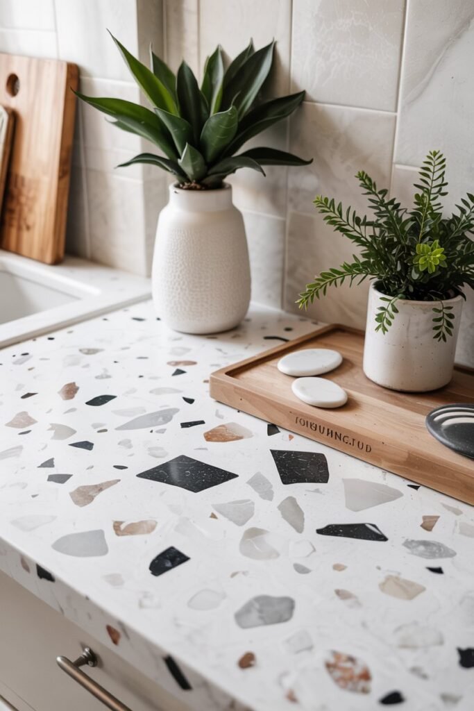 Modern terrazzo offers more refined appearances than vintage versions. I’ve created beautiful surfaces using recycled glass and marble chips.