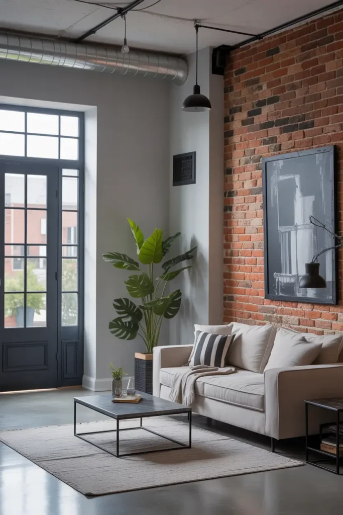 A concrete-inspired gray is a great base for the main walls. I often suggest leaving or adding a brick accent wall for texture and warmth. Black trim and doors can add to the industrial feel, creating sharp lines and a bold statement.