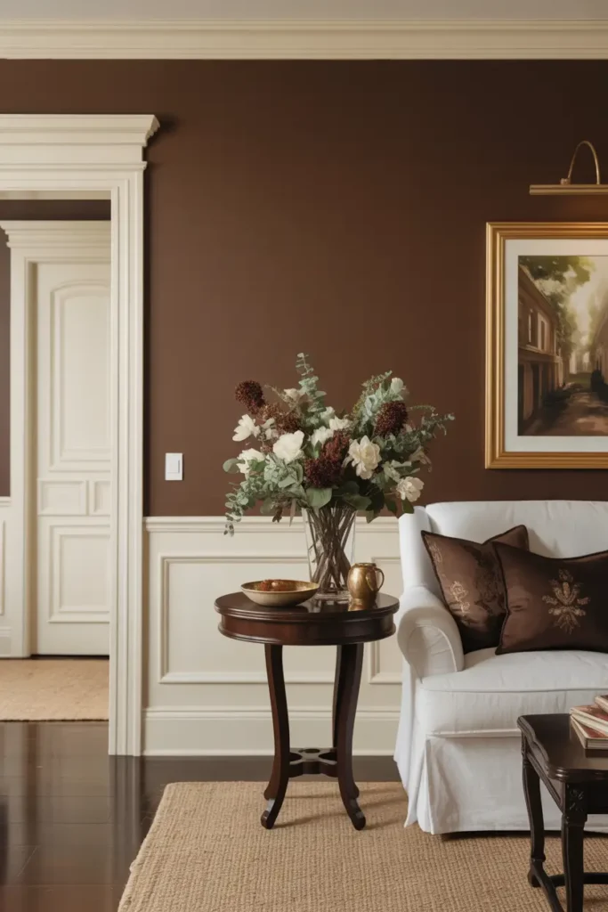 For a look that feels decadent, warm, and traditional, I turn to a palette of rich brown and cream. This scheme creates a cozy and luxurious environment that is perfect for a classic home.