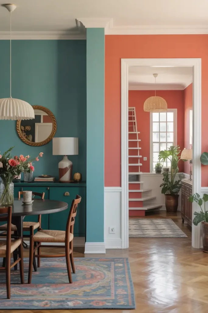 The key to making an eclectic palette work is to have a connecting thread. This could be a consistent trim color (like a clean white) or a shared undertone among the different colors. For example, you could have a teal dining room and a coral entryway, but both colors have a similar muted quality.