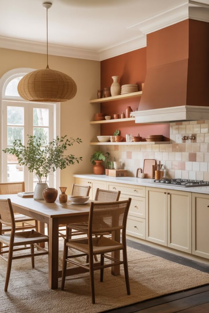 A soft, sandy beige works well as the main color. I then use terra cotta as a feature color in a kitchen or dining area to add warmth and personality. Creamy white trim complements these earthy tones beautifully, keeping the look soft and natural.