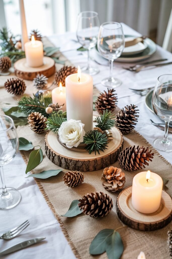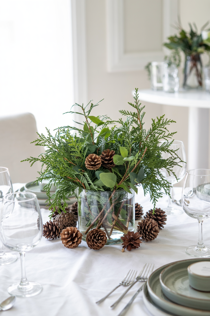 Scatter pinecones of varying sizes throughout the greenery, and you’ve created a centerpiece that smells like a winter forest. The natural oils in the evergreens will keep your arrangement fragrant for weeks, making this both beautiful and long-lasting.