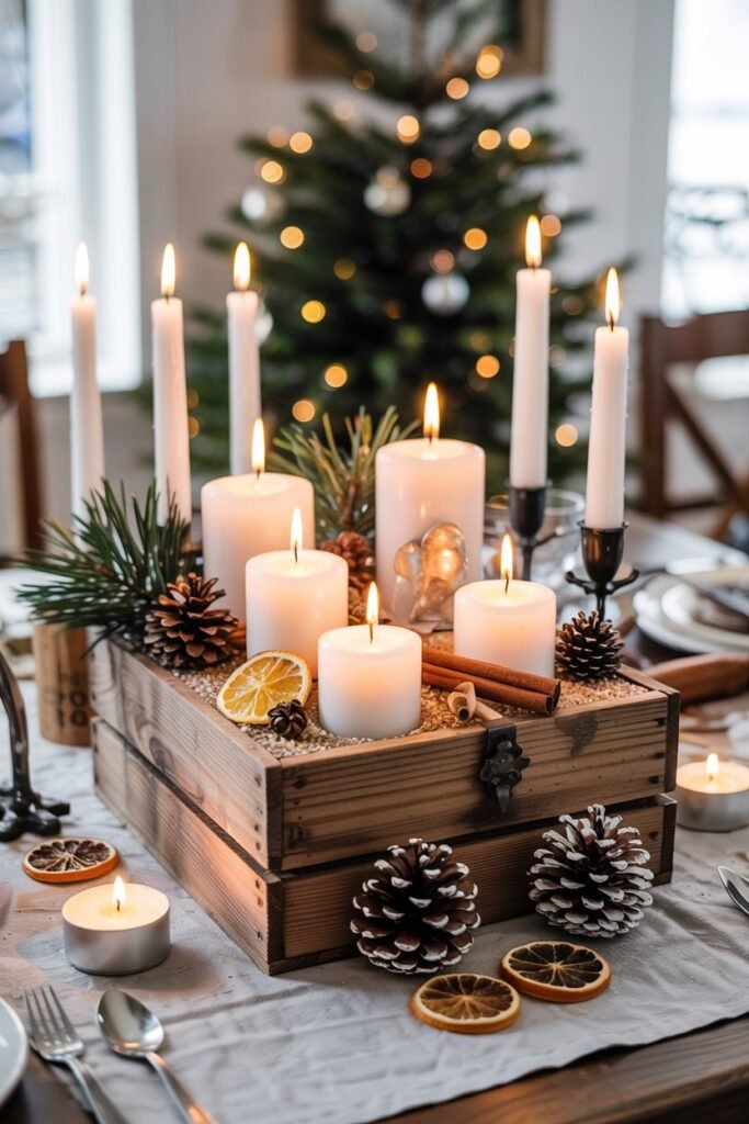 Surround the candles with pinecones, cinnamon sticks, and dried orange slices for added texture and scent. This centerpiece brings farmhouse charm to any winter table setting and photographs beautifully.