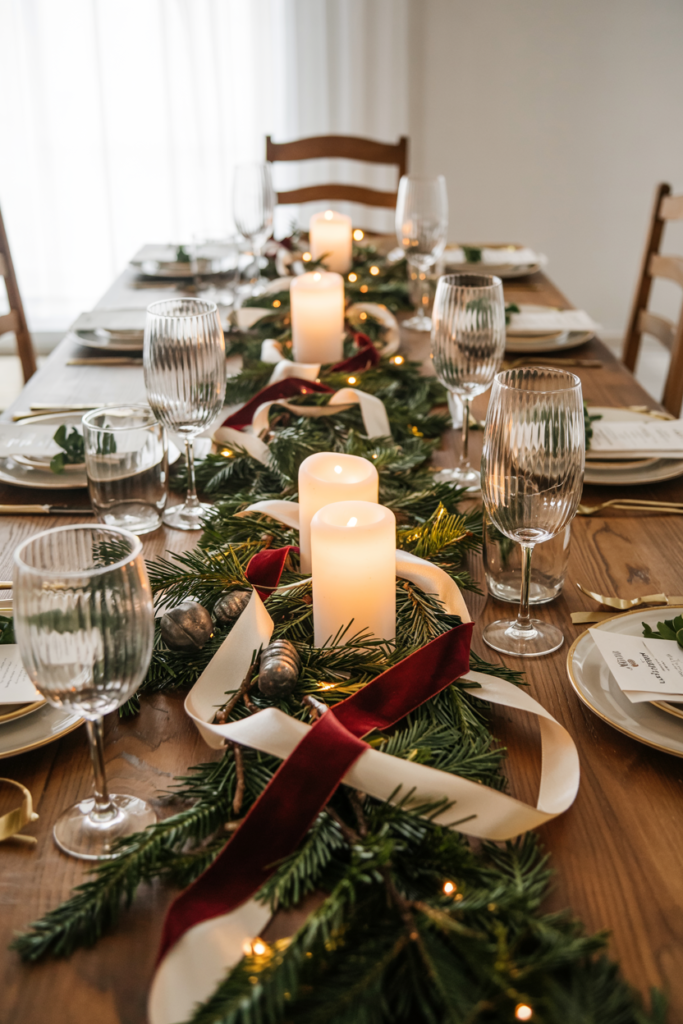 Creating a garland that runs the length of your table allows for a dramatic, cohesive look. I weave fresh pine branches with wide satin or velvet ribbon in deep winter colors.