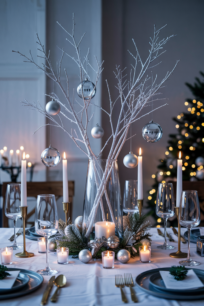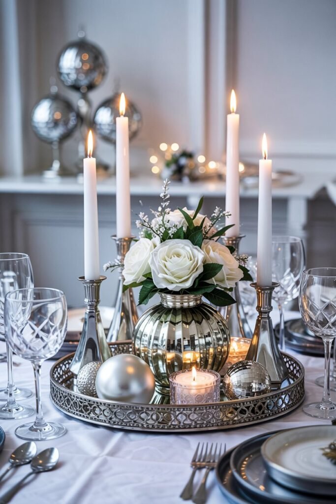 I combine crystal candlesticks of different heights with silver ornaments and mirror pieces to create sophisticated sparkle. Place everything on a silver tray or mirrored surface to amplify the light reflection.