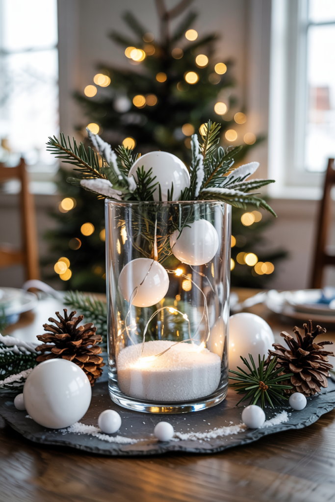 I create winter magic by layering different materials in clear glass vases. Start with white sand or salt at the bottom, add artificial snow in the middle, and top with white ornaments or pinecones.