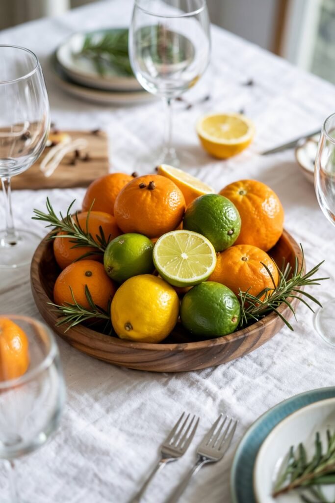 Fresh oranges, lemons, and limes studded with whole cloves create a centerpiece that’s both beautiful and fragrant. I nestle them among fresh rosemary sprigs in a wooden bowl.