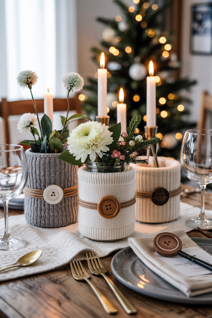 I wrap glass vases or jars in cozy knit scarves or sweater sleeves, securing them with decorative buttons. Fill the wrapped containers with winter flowers, branches, or candles.