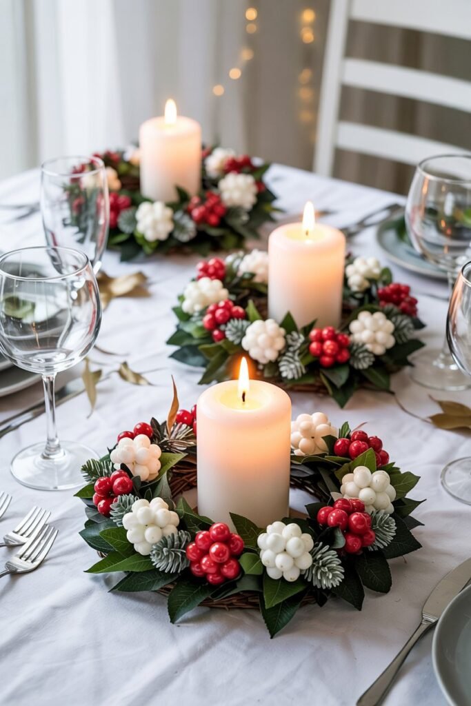 I create low, flat wreaths using artificial winter berries and preserved leaves, then place pillar candles in the center. These work beautifully as individual place settings or as one large centerpiece.