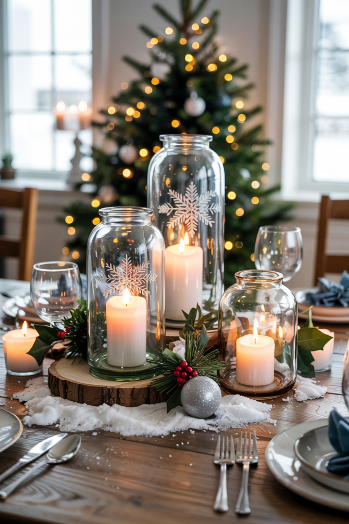 Nothing creates winter ambiance like flickering candlelight through frosted glass. I recommend using three lanterns of different heights to create visual interest down your table’s length.