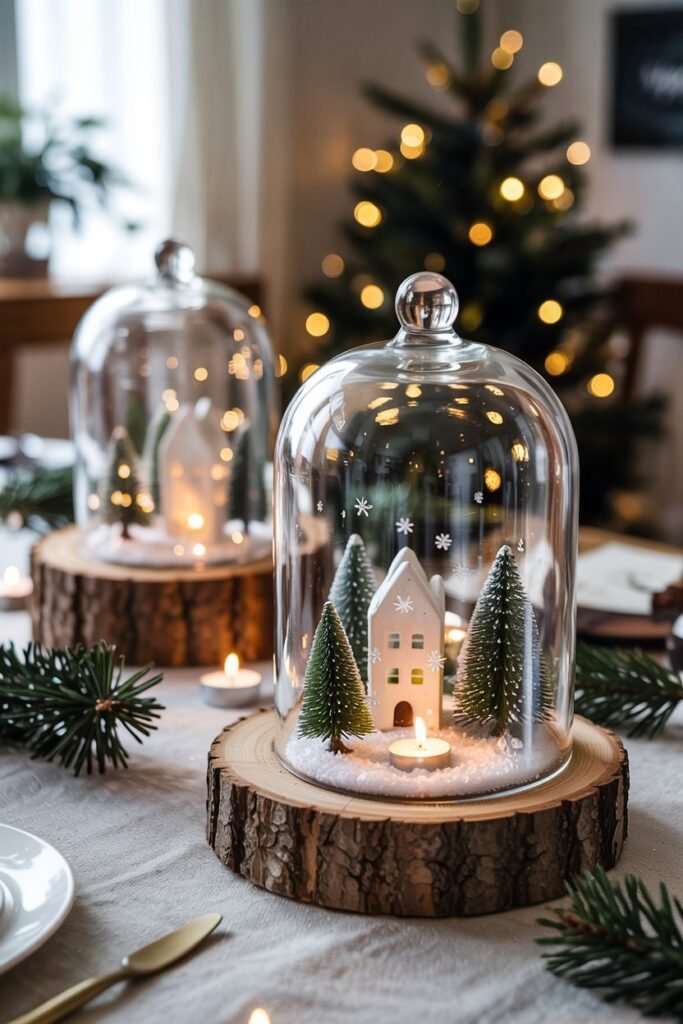 I create miniature winter wonderlands under glass cloches or large glass bowls turned upside down. Inside, arrange small trees, houses, or figurines with artificial snow.
