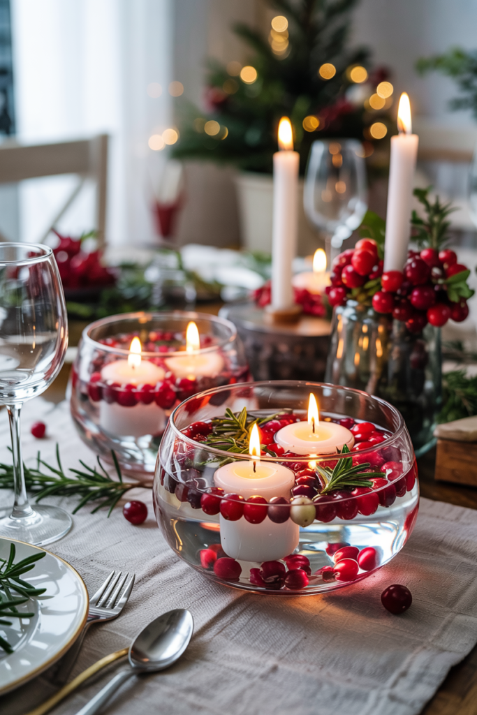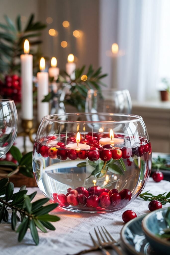 Fresh cranberries floating in water create one of my favorite winter centerpieces. Fill a large glass bowl with water, add cranberries until they cover the surface, then float small tea lights between them.