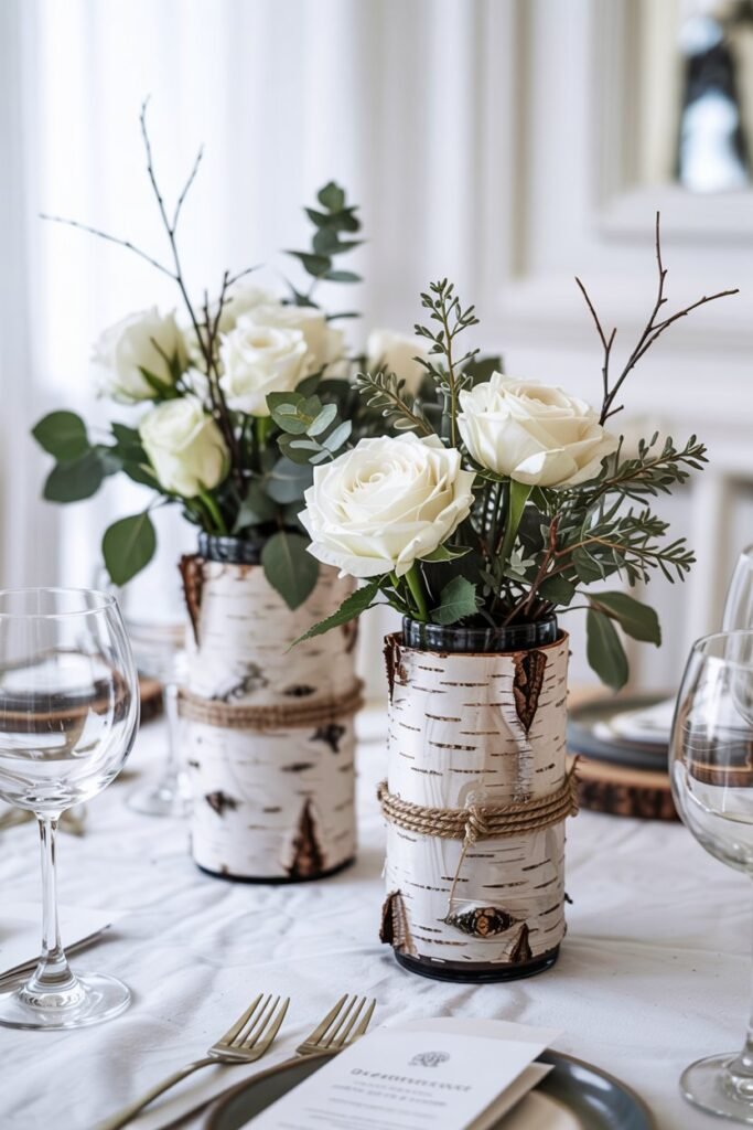 This technique works especially well for tall, cylindrical vases. The natural texture of birch bark adds rustic elegance that complements both modern and traditional table settings perfectly.