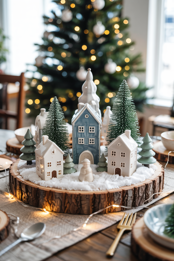 I transform my table into a winter wonderland using small ceramic houses, trees, and figurines. Create depth by placing taller items in back and shorter ones in front.