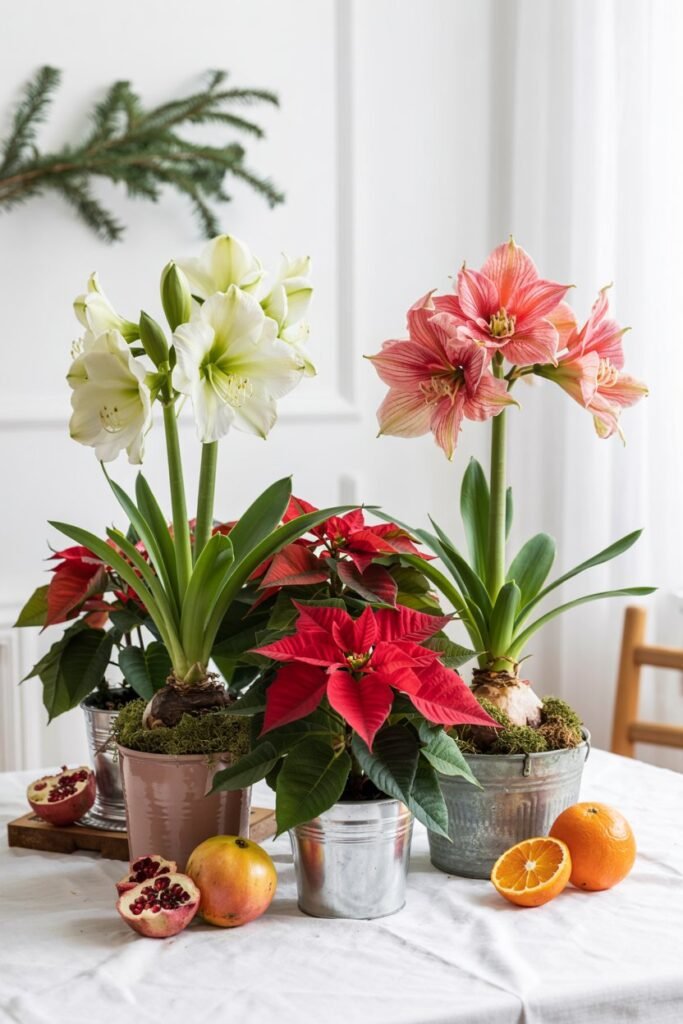 Create a long-lasting tabletop display with a combination of amaryllis bulbs and mini poinsettias. Plant them in a shallow container, filling any gaps with moss for a polished, seasonal look.