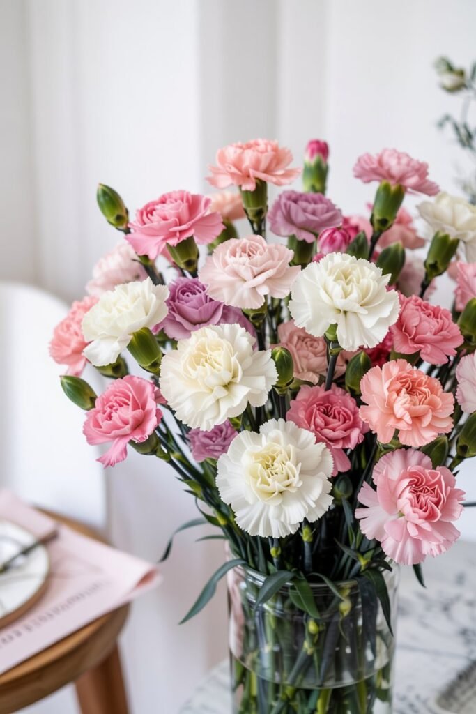 Don’t underestimate the humble carnation for your winter decor. Often overlooked, these resilient and charming flowers are an absolute gem for cold-weather arrangements.
