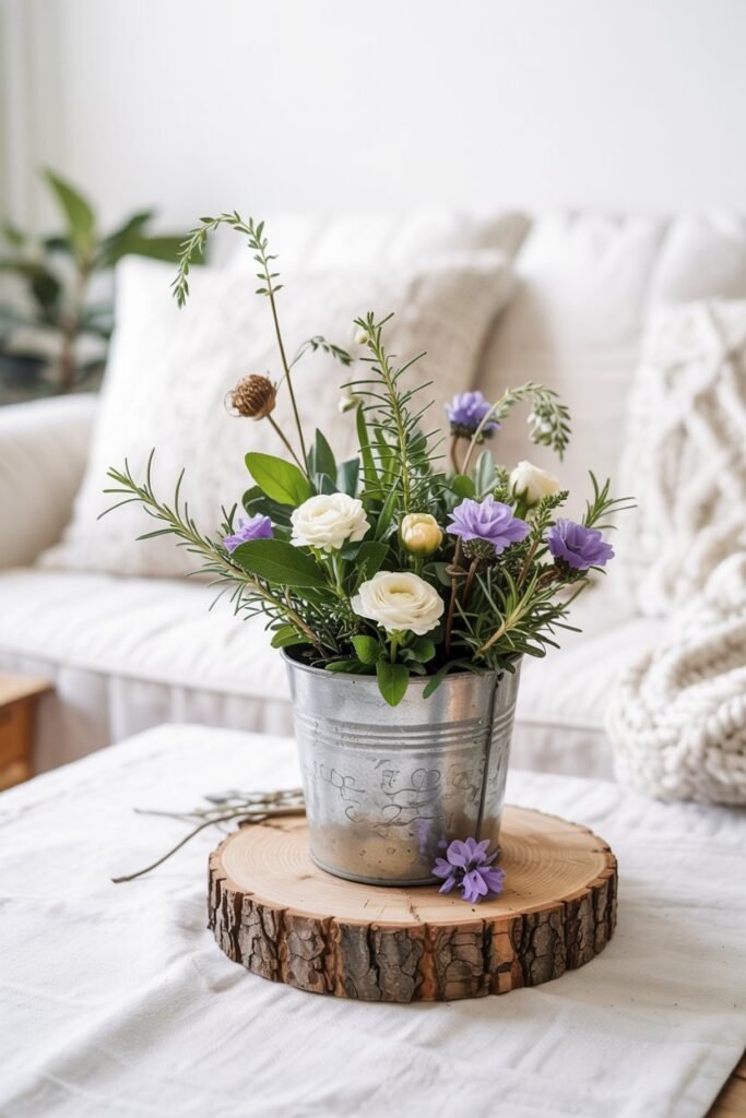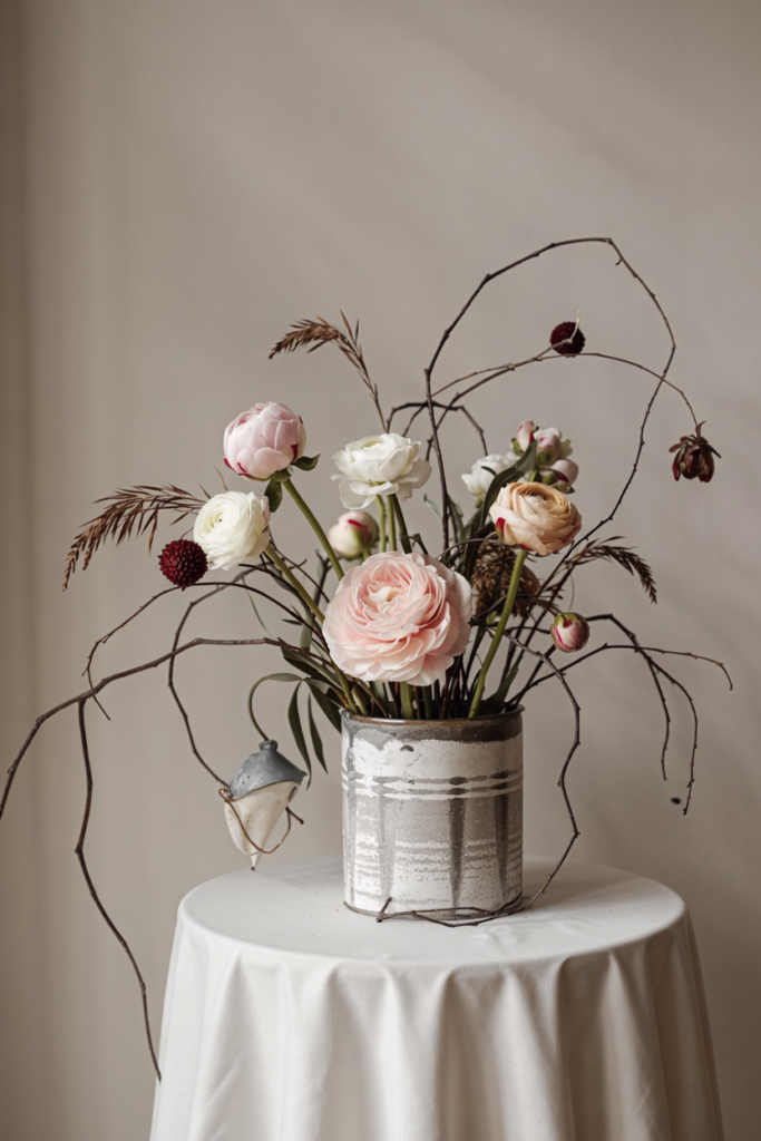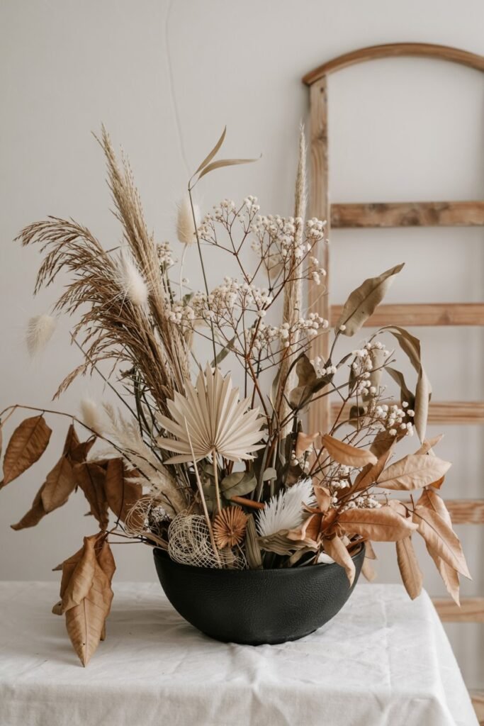 For a low-maintenance yet stunning arrangement, turn to dried elements. Pampas grass, dried lunaria, beech leaves, and baby’s breath can be combined for a long-lasting, rustic display.